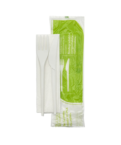 €11340Prezzo unitario /Non disponibileSet bis Forchetta e coltello in CPLA bio bianco imbustato con tovagliolo - 160 mm