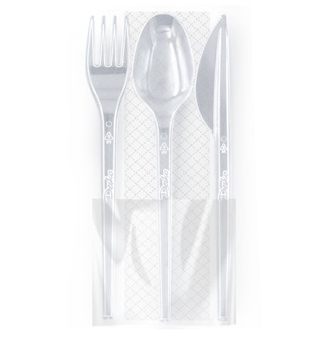Set tris Forchetta, cucchiaio e coltello in plastica riutilizzabile imbustato con tovagliolo